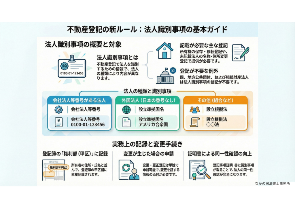 「法人識別事項」とは、不動産登記において法人を識別するための情報です。法人の種類によって、記載される内容が異なります。
